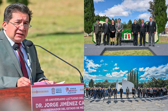 En el marco del vigésimo aniversario luctuoso del exgobernador Jorge Jiménez Cantú (1914-2005), la diputada Martha Azucena Camacho Reynoso (morena), presidenta de la Directiva del Congreso mexiquense, y el legislador Gerardo Pliego Santana (morena) participaron en la ceremonia cívica y guardia de honor en memoria del exmandatario, realizada en la Rotonda de Personas Ilustres, en el Panteón Municipal de Toluca.