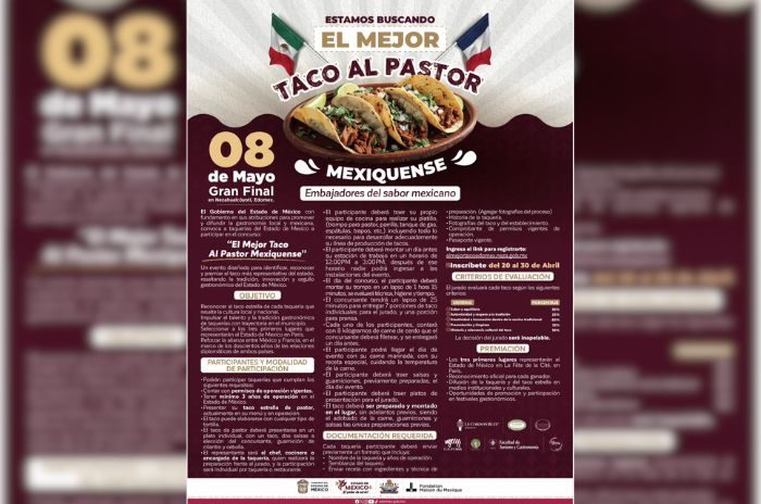 El certamen está dirigido a taquerías mexiquenses con trayectoria y tiene como propósito reconocer el talento, la tradición y la creatividad de quienes, desde el trompo, han construido uno de los platillos más representativos de México. La iniciativa es impulsada por el chef Axel García, representante de la Casa México en Francia y difusor de la cultura gastronómica a nivel internacional.