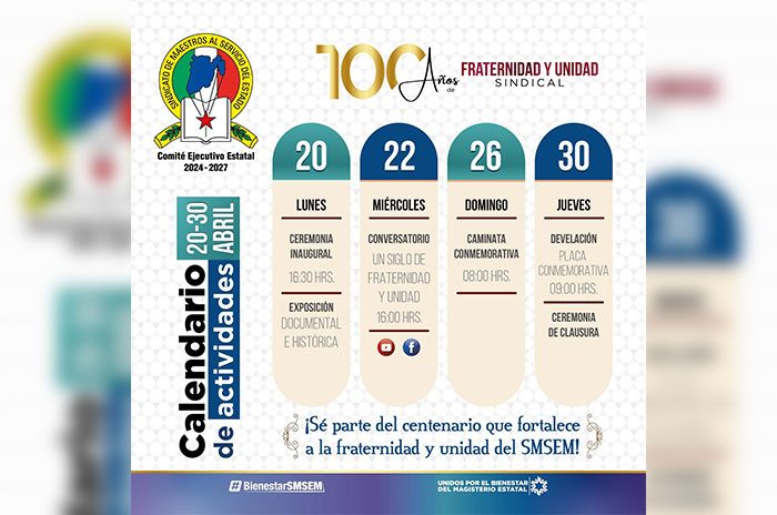 El Sindicato de Maestros al Servicio del Estado de México (SMSEM) anunció una serie de actividades para conmemorar el centenario de un hecho considerado como el origen de la organización magisterial en la entidad, que se remonta al 30 de abril de 1926 con la fundación de la Sociedad Mutualista de Maestros “Ánfora”.