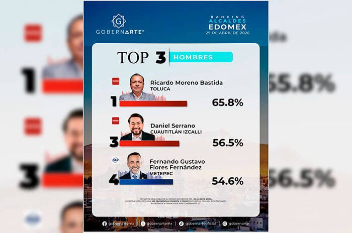 La medición también ubica a Ricardo Moreno en el Top 3 de alcaldes hombres y en el Top 3 de presidentes municipales de Morena, de acuerdo con el ejercicio de evaluación ciudadana.