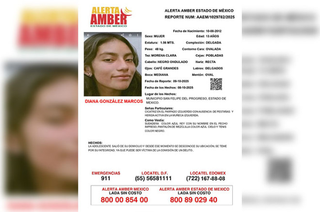 La familia difundió la ficha de la Alerta Amber emitida por la Fiscalía General de Justicia del Estado de México (FGJEM) y pidió compartir la información para ampliar las posibilidades de localizar a Diana.