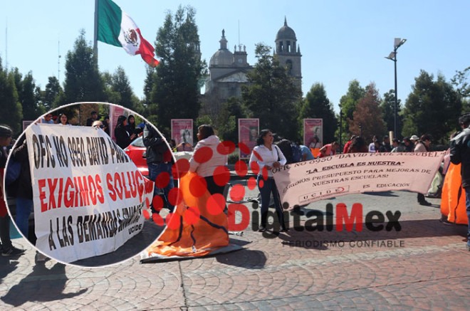 Este miércoles, maestros de la Unión de Comités Izquierda Democrática de Chimalhuacán se manifiestan frente a Palacio de Gobierno para exigir el cumplimiento a demandas educativas. La avenida Sebastián Lerdo de Tejada se encuentra cerrada desde Miguel Hidalgo hasta Bravo.