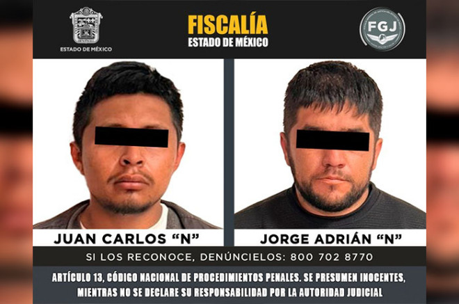 Elementos de la Fiscalía General de Justicia del Estado de México cumplimentaron una orden de aprehensión en contra de dos individuos identificados como Juan Carlos “N” y Jorge Adrián “N”, por su posible participación en el delito de robo de vehículo con violencia, encubrimiento por receptación y portación de arma prohibida.