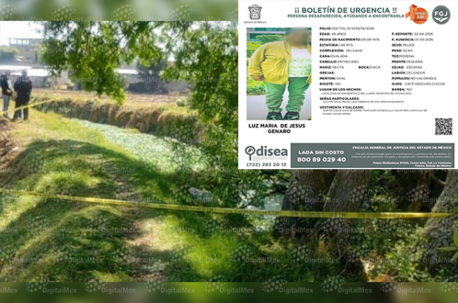 Luz María, de 49 años, fue localizada sin vida en un canal de aguas del poblado de San Bartolo del Llano, en el municipio de Ixtlahuaca; su cuerpo presentaba evidentes huellas de violencia.