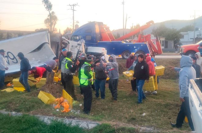 La mañana de este martes, un tráiler que transportaba cajas de pollo perdió el control y volcó sobre la autopista Toluca-Atlacomulco, a la altura del kilómetro 54, en el paraje conocido como “El Ruso”.