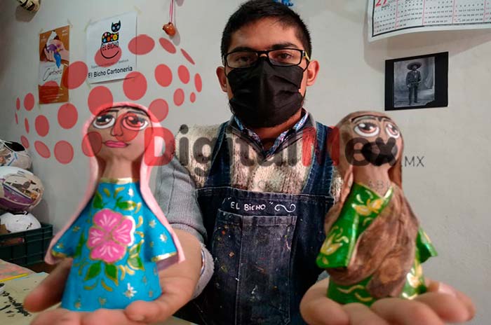En el taller Bicho Cartonería, Pablo Salazar realiza nacimientos de diversos tamaños basados principalmente en cartón reciclado, papel periódico y engrudo, a los que da vida con colores llamativos que le permiten ofrecer artesanías únicas en esta temporada decembrina.