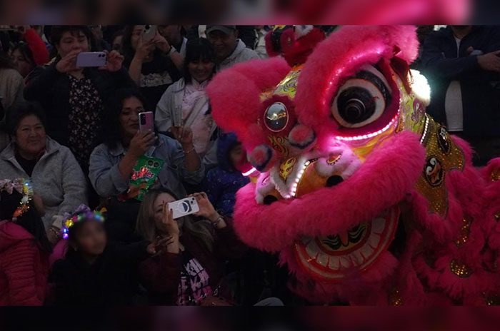 La actividad, realizada en el primer cuadro del municipio, reunió a familias y visitantes con una programación dirigida a públicos de todas las edades. Entre las presentaciones destacó la ejecución de esta danza tradicional por parte de Xinkuan Shi Sat Ping, así como la danza del listón y otros números artísticos que evocaron la cultura china.
