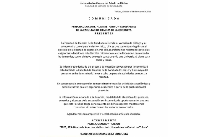 Mediante comunicados oficiales difundidos en redes sociales, la Facultad de Ciencias de la Conducta informó que refrenda su vocación de diálogo y su compromiso con el pensamiento crítico, pilares fundamentales de la libertad de expresión, y que, derivado de una votación realizada los días 7 y 8 de mayo, se decidió suspender todas las actividades académicas y administrativas.