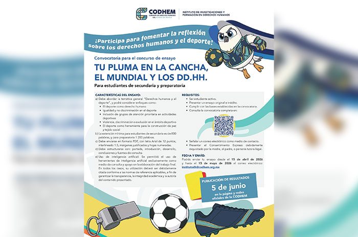 La Comisión de Derechos Humanos del Estado de México (CODHEM) abrió la convocatoria al concurso de ensayo “Tu pluma en la cancha, el Mundial y los derechos humanos”, dirigido a estudiantes de secundaria y preparatoria, con el objetivo de promover la reflexión sobre el deporte como un espacio de inclusión, igualdad y desarrollo integral.