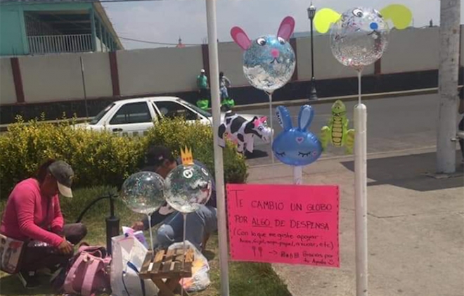 "Te cambio un globo por una despensa", dice en letras mayúsculas el mensaje de la vendedora ambulante.