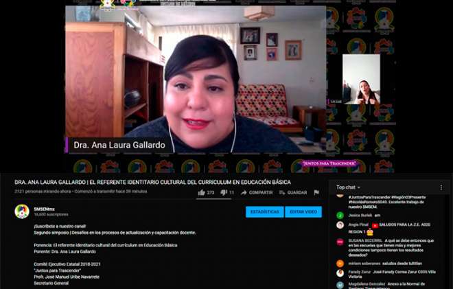 El Secretario General, José Manuel Uribe, fue el encargado recibir a quienes se conectaron a la conferencia “El referente identitario cultural del currículum en Educación Básica”, impartida por la doctora en Pedagogía por la Universidad Nacional Autónoma de México (UNAM), que hasta este momento acumula más de 13 mil visualizaciones en la plataforma YouTube.