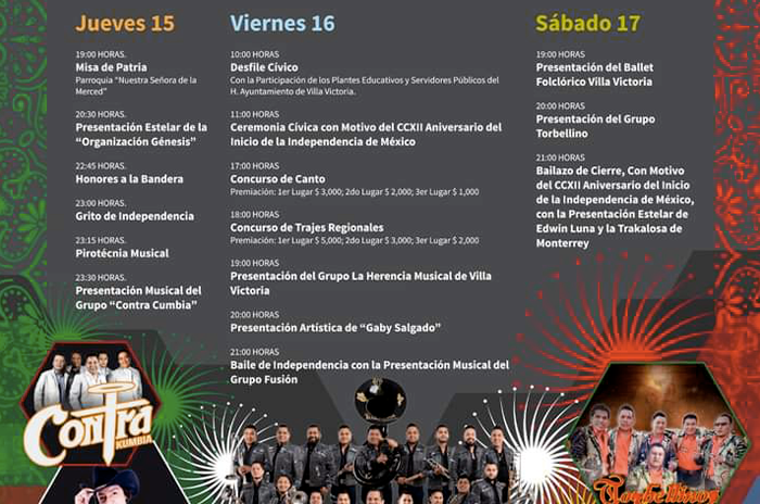 El viernes 16 de septiembre comenzarán las actividades desde las 10:00 de la mañana con el desfile cívico, la ceremonia cívica del 212 aniversario del inicio de Independencia de México y por la tarde, continuarán con un concurso de canto, concurso de trajes regionales, la presentación del grupo La Herencia Musical de Villa Victoria, cerrando con el baile de independencia y la presentación musical del Grupo Fusión.