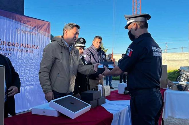 Entre el equipo entregado también destaca cinturones tácticos, candados de mano, kit primer respondiente (patrulla), computadoras de escritorio, computadoras portátiles y videocámaras, además de los protocolos de actuación policial ante hechos delictivos y protocolo para la actuación policial ante casos de violencia contra la mujer y feminicidios.