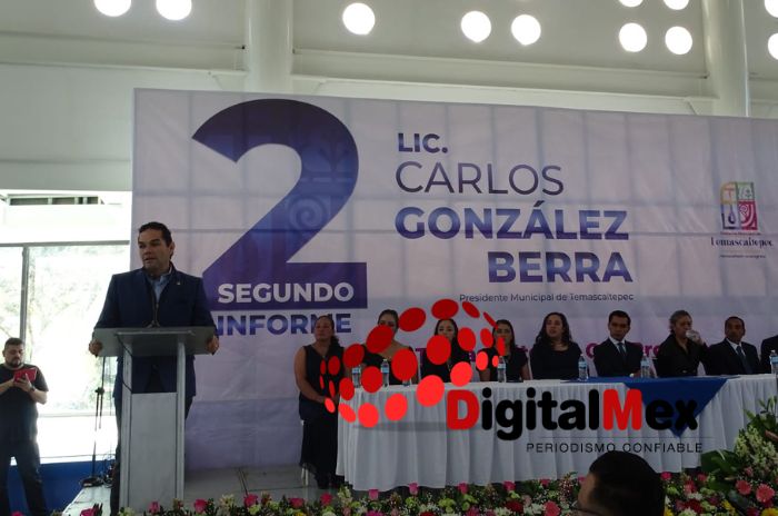 En presencia de María Eugenia Rojano Valdés, secretaria del campo y digna representante de la gobernadora del Estado de México, Delfina Gómez Álvarez, del diputado coordinador del grupo parlamentario del PAN en la cámara alta, Anuar Azar Figueroa, de la legisladora federal por el distrito 36, Jazmín Jaimes Albarrán, del diputado local, Enrique Vargas Villar, de la presidenta de San Simón de Guerrero, Sara Mora, de la sindico de Toluca, Emma Álvarez Villa Vicencio, de ex presidentes municipales, servidores públicos estatales y municipales, sindica y regidores, rinde su segundo informe de gobierno, Carlos González Berra, presidente municipal constitucional de Temascaltepec.