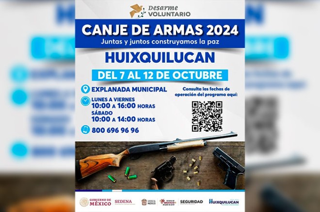 El Gobierno de Huixquilucan invita a la población al “Canje de Armas 2024” que estará vigente hasta el próximo 12 de octubre, en un horario de lunes a viernes de 10:00 a 16:00 horas; y sábado, de 10:00 a 14:00 horas. Para mayor información los interesados pueden comunicarse al número telefónico 800 696 96 96.