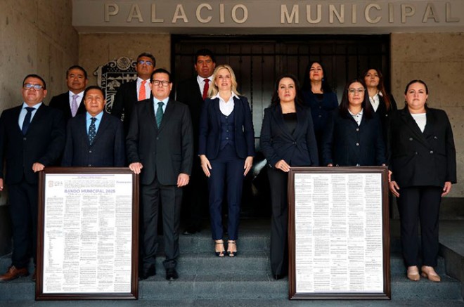 Romina Contreras, junto con los integrantes del Cabildo, colocó el Bando Municipal 2025 en el Palacio Municipal y, posteriormente, se instaló en los centros administrativos de Pirules, Plaza Andador (Fresko), Ex Cinemas, así como en el mercado municipal "25 de agosto", en la Cabecera Municipal.