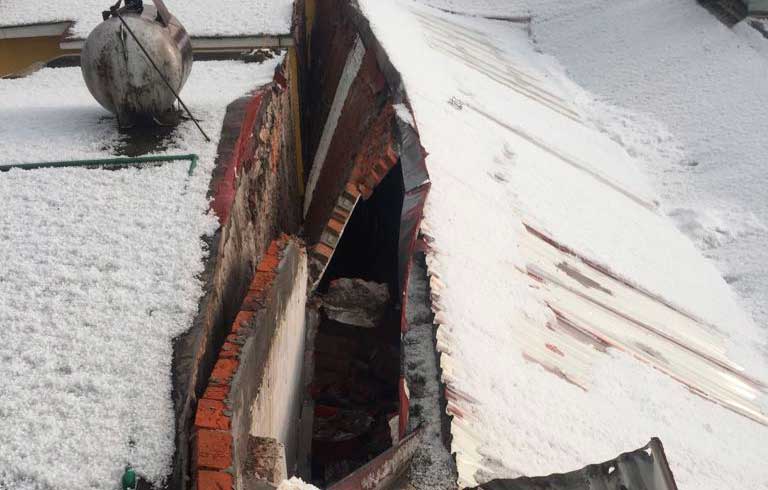 Después de la intensa granizada registrada el domingo 22 de abril, en la que más de 5 toneladas de hielo se precipitaron sobre la capital del Estado de México, la estructura y barda de “Farmacias Guadalajara”, ubicada en Jesús Carranza, esquina Bosques de Flamboyanes, colapsó.