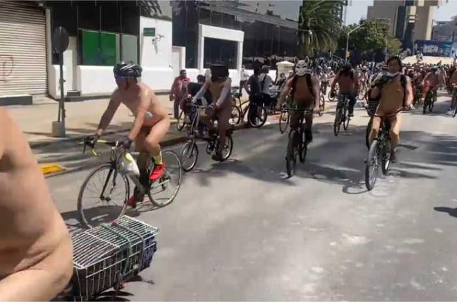 Ante la mirada de transeúntes y conductores, los ciclistas desnudos, en su mayoría hombres, gritaron consignas para exigir a las autoridades mayor seguridad vial y respeto hacia ellos.