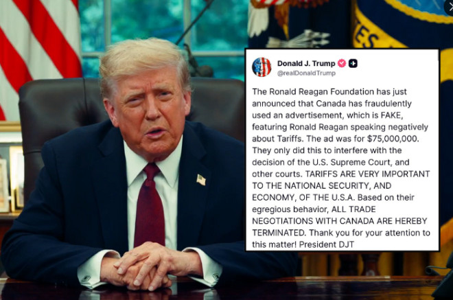 “La Fundación Ronald Reagan acaba de anunciar que Canadá ha usado de manera fraudulenta un anuncio FALSO en el que aparece Ronald Reagan hablando negativamente sobre los aranceles”, escribió Trump.