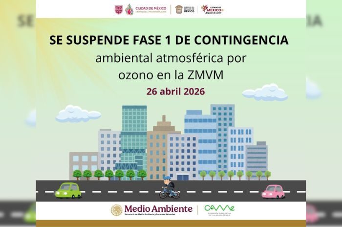 La Comisión Ambiental de la Megalópolis informó que, con fundamento en los programas para prevenir y responder a contingencias atmosféricas en la Zona Metropolitana del Valle de México (ZMVM), se suspende la contingencia ambiental por ozono y todas sus medidas a partir de las 19:00 horas de este domingo.