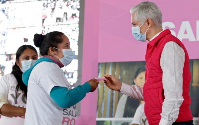 El gobernador del Estado de México, Alfredo del Mazo Maza entregó 6 mil 200 tarjetas del programa Familias Fuertes Salario Rosa a mujeres de 22 municipios, con lo que este apoyo beneficia a más de 411 mil mexiquenses.
