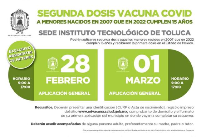 No obstante, en Metepec solo se aplicará la segunda dosis a jóvenes nacidos en 2007 que este año cumplen 15 años y, la única sede habilitada será el Instituto Tecnológico de Toluca de 09:00 a 17:00 horas.