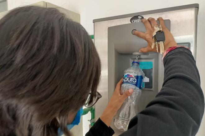 Asimismo, Andrea, estudiante de la licenciatura en Historia, dijo que solo basta con tener una botella de plástico para rellenarla, en menos de dos minutos y llevarla hacia el aula.