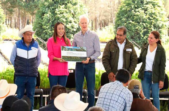 El mandatario mexiquense recalcó que la entidad es la única en el país que aumenta su superficie forestal año tras año, lo cual es un gran avance y representa un reto para continuar trabajando y mantener el ritmo de crecimiento forestal, mediante el desarrollo de tecnología e infraestructura, capacitación, impulso de plantaciones forestales comerciales para la reconversión productiva, la apertura de mercados de productos maderables y no maderables, entre otras acciones.