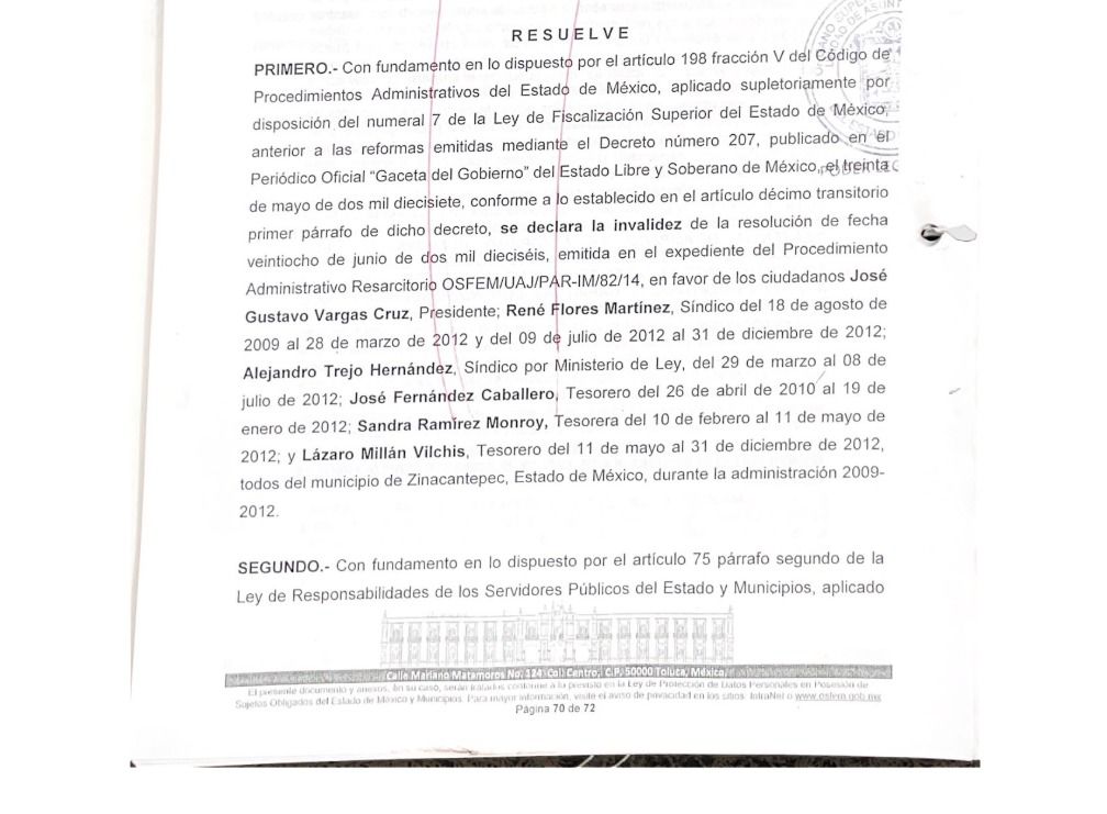 Posteriormente, Vargas Cruz presentó el Recurso de Revisión RR-PAR/145/2016 del Órgano Superior de Fiscalización del Estado de México, (OSFEM), el cual declara la invalidez de una resolución previa y determina la inexistencia de responsabilidad administrativa en su contra, desestimando una supuesta deuda de 300 millones de pesos que, en realidad, ascendía a solo 5.7 millones de pesos, cuyo pliego preventivo de responsabilidad ha sido cancelado.