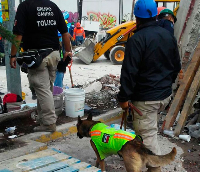 Con un estado de fuerza de nueve binomios caninos, que arribaron la madrugada del miércoles 20 de septiembre a la Ciudad de México, el municipio de Toluca apoyó en diversas zonas de desastre: en las calles de Chimalpopoca y Bolívar, colonia Obrera Delegación Cuauhtémoc, donde Paca y Peluca ubicaron a dos personas con vida y tres cuerpos, que posteriormente fueron rescatados por personal de la Marina Armada de México.