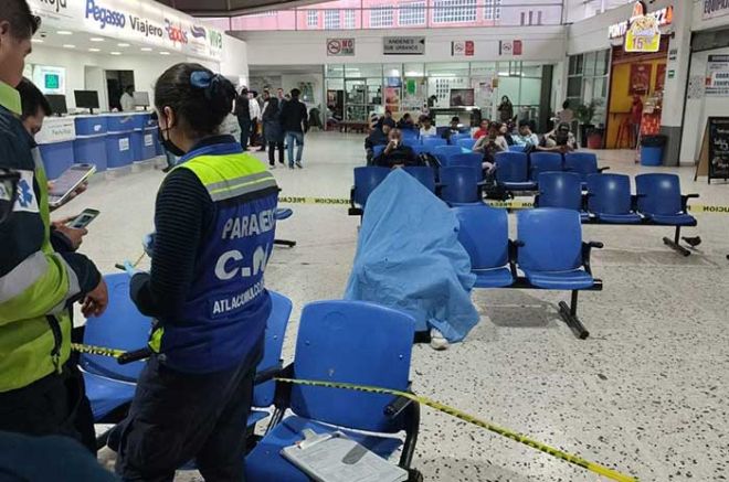 La gente se percató que aquel hombre sentado en una banca al interior de la terminal, ubicada en el circuito Jorge Jiménez Cantú, ya llevaba varios minutos y no se movía.