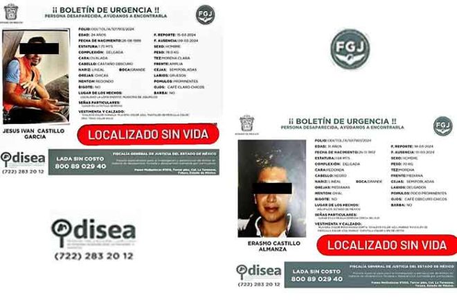Se trata de Jesús Iván "N" y Erasmo "N", de 24 y 31 años respectivamente, quienes fueron reportados como desaparecidos entre el 9 y 10 de marzo, en el municipio de Jiquipilco.