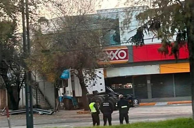 El tractocamión de color blanco, con logotipos en los costados de TUM Logística Nestlé, derribó seis postes, un transformador y terminó estrellándose contra una tienda Oxxo, la cual estaba cerrada, según se indicó.
