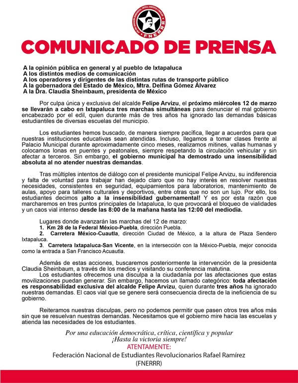 De acuerdo con el comunicado dirigido al pueblo de Ixtapaluca, a los operadores y dirigentes de las distintas rutas de transporte público, a la gobernadora del Estado de México, Mtra. Delfina Gómez Álvarez, y a la Dra. Claudia Sheinbaum, presidenta de México; la FNERRR responsabiliza directamente al alcalde Felipe Arvizu de las afectaciones que provocará la protesta del día 12 de marzo, pues enfatizaron que “el caos vial que se genere será consecuencia directa de la ineficiencia de su gobierno”.