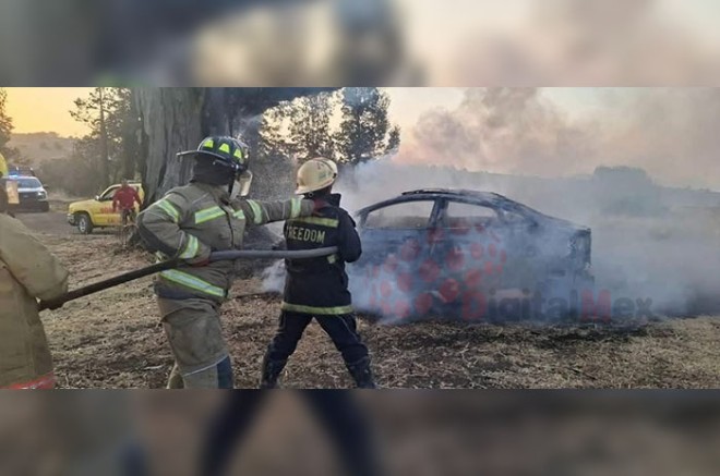 Un vehículo fue consumido por las llamas con una persona en su interior, la tarde de este lunes en el municipio de Calimaya.