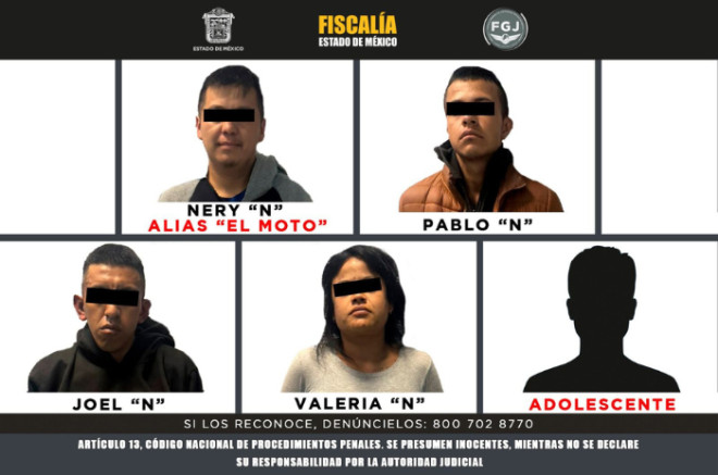 Elementos de la Fiscalía General de Justicia del Estado de México (FGJEM) detuvieron a Nery “N”, alias “El Moto”, Joel “N”, Pablo “N”, Valeria “N” y una adolescente de 15 años por su probable participación en el delito de secuestro en agravio de F.G.S., padre de un transportista del municipio de Jilotepec.