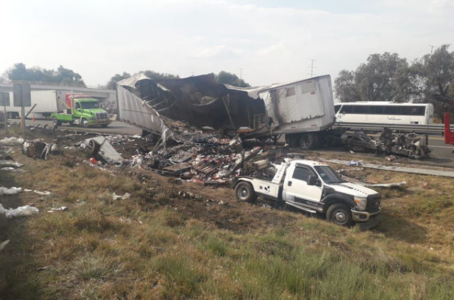 El accidente ocurrió en la conocida “Y” de la desviación entre las autopistas México-Pirámides y México-Tulancingo, a la altura del kilómetro 18+220, donde el tráiler cargado con rollos de papel higiénico se impactó contra el muro de contención y posteriormente se incendió, ocasionando daños a la infraestructura.