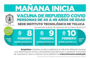 A partir de hoy se aplicará la vacuna de refuerzo contra Covid-19 para personas de 40 a 49 años en los municipios de Toluca y Metepec.